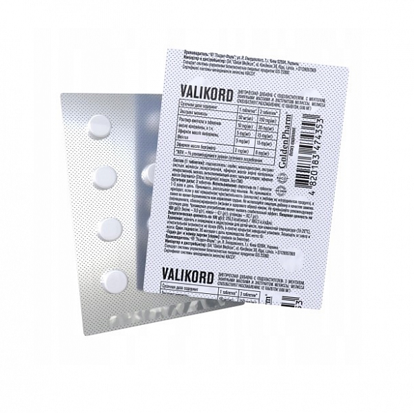 Menthol solution in valerian oil (including: valerian essential oil – 5 mg, menthol – 5 mg), bergamot essential oil – 2 mg, lemon balm extract 5:1 – 50 mg, excipients: sorbitol, maltodextrin, calcium stearate.